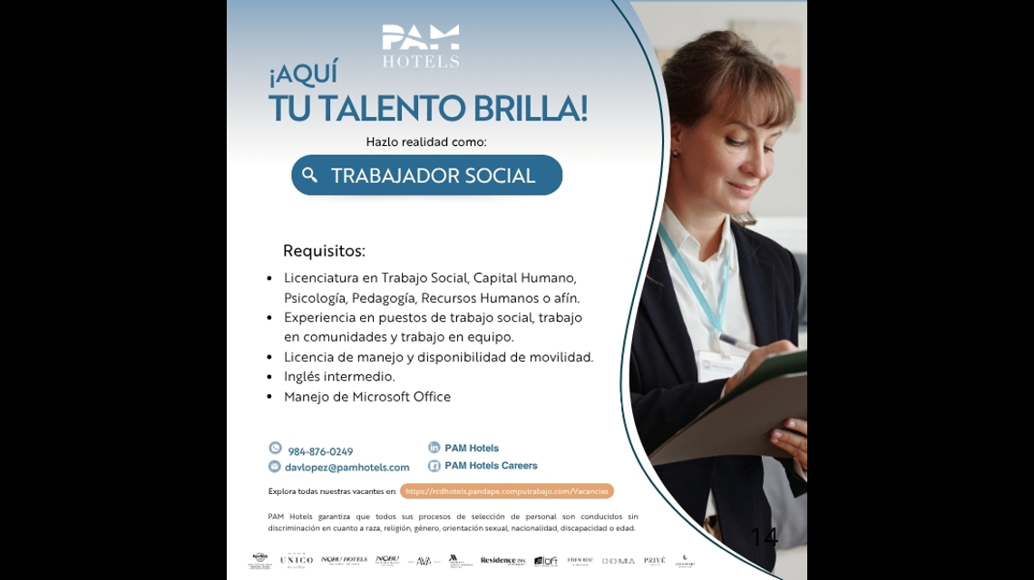 PAM Hotels es un grupo hotelero de lujo en diferentes destinos turísticos como México, República Dominicana y Estados Unidos, Estamos en búsqueda de tu talento como: