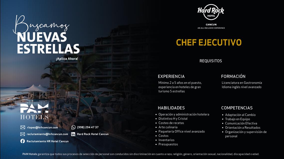 Chef Ejecutivo Hard Rock Cancún - Con experiencia en hotelería
